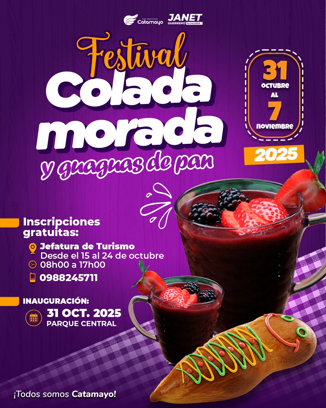 Desde la Municipalidad fomentamos espacios que se convierten en vitrinas para nuestros emprendedores locales. Inscríbete de forma gratuita y sé parte del Gran Festival de la Colada Morada. Deliciosa tradición que une a Catamayo.