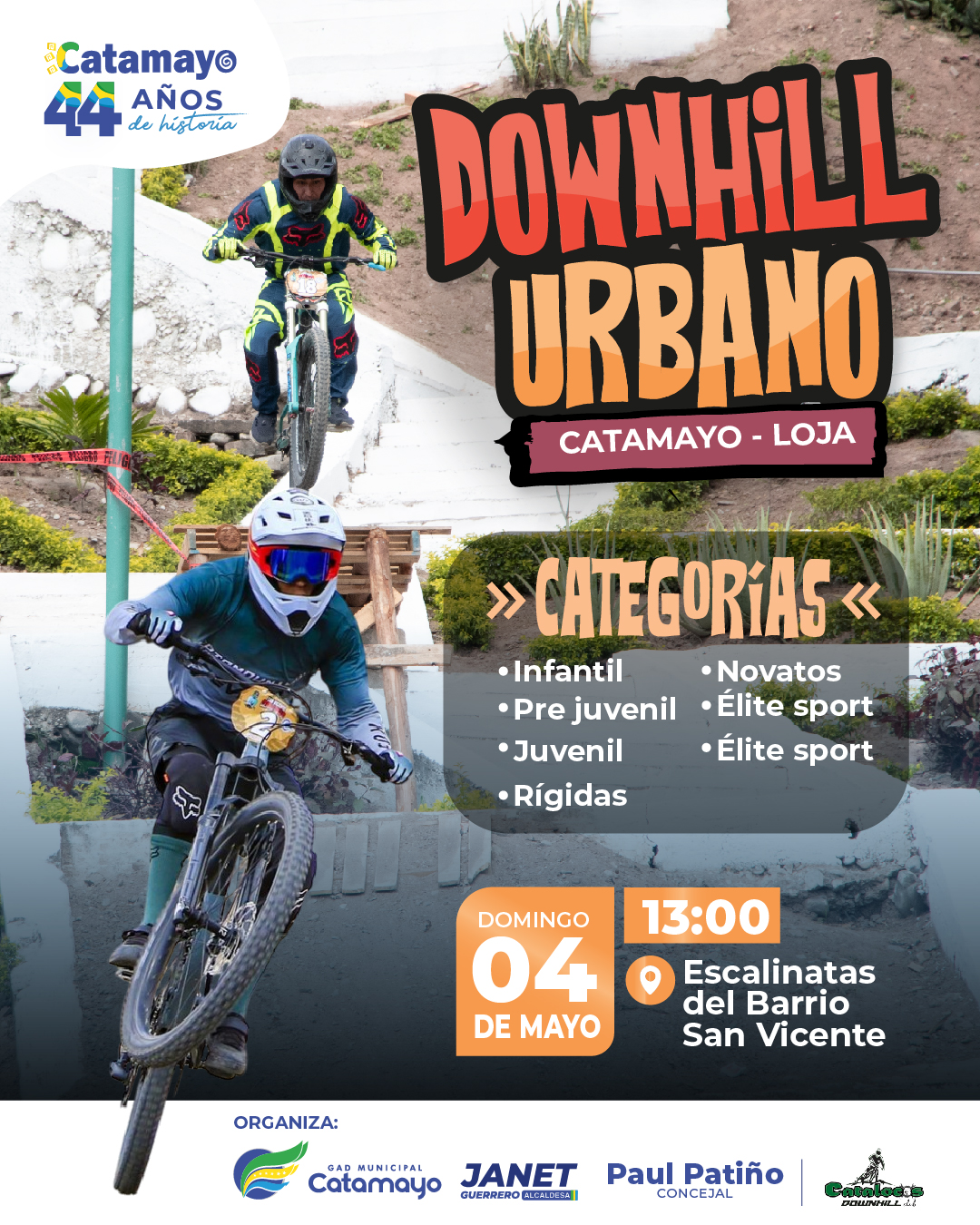 El Gobierno Autónomo Descentralizado Municipal de Catamayo, en coordinación con el apasionado equipo de downhill Catalocos y Paul Patiño concejal de Catamayo, tiene el honor de invitarte a la emocionante competencia de ciclismo extremo: